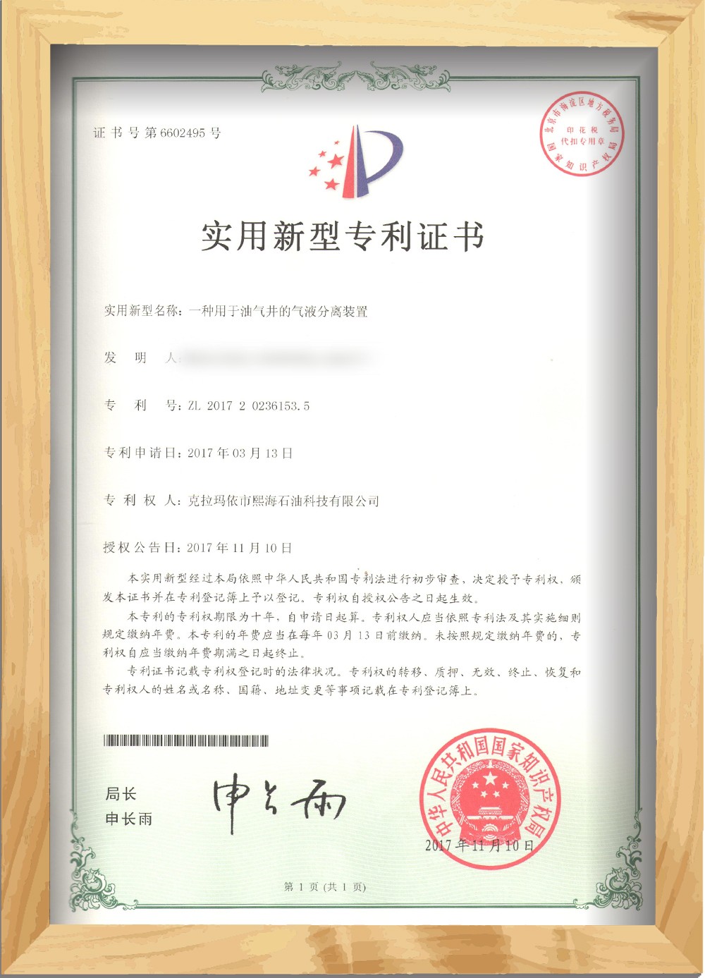 實用新型 一種用于油氣井的氣液分離裝置